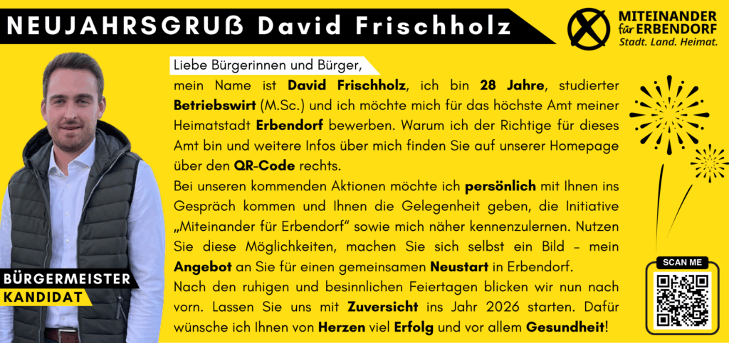 Neujahrsgruß MfE Beitrags-Autor:David Frischholz Beitrag veröffentlicht:2. Januar 2026 Beitrags-Kategorie:Uncategorized Das könnte dir auch gefallen 22. Oktober 2025 Eintragung in die Unterstützerlisten 20. Dezember 2025 ÖFFENTLICHE EINLADUNG ZUR NOMINIERUNGSVERSAMMLUNG 2. Dezember 2025
